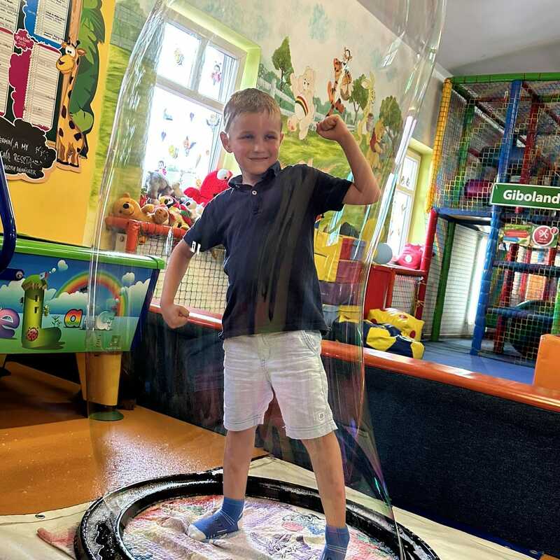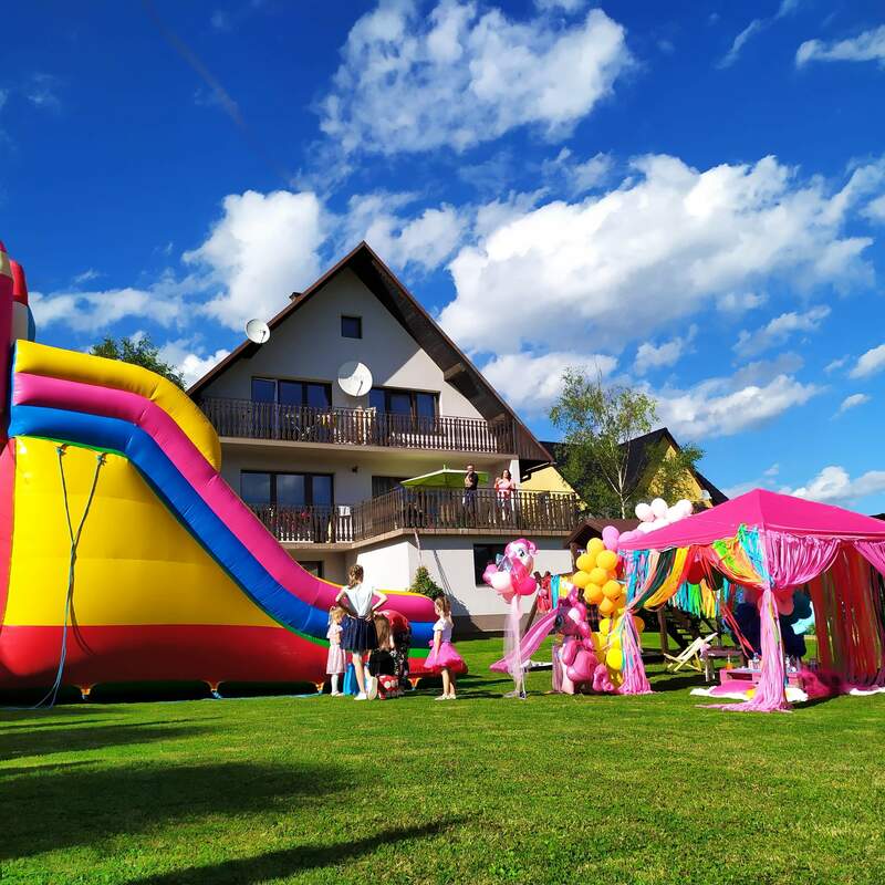 W sezonie od 1 maja do połowy listopada, udostępniamy urządzenia dmuchane. Giboland wynajmuje dmuchańce z obsługą w pakiecie z animacją, zatem jest to super pomysł na świętowanie urodzin dziecka w przydomowym ogrodzie. Do dyspozycji mamy kilka atrakcji z których najpopularniejsze są zjeżdżalnie dmuchane o wymiarach 9m x 8,5m x 8m. Koszt wynajmu to 200 zł za godzinę i aby móc skorzystać z oferty, konieczne są dogodne warunki pogodowe i możliwość dojazdu samochodem dost.