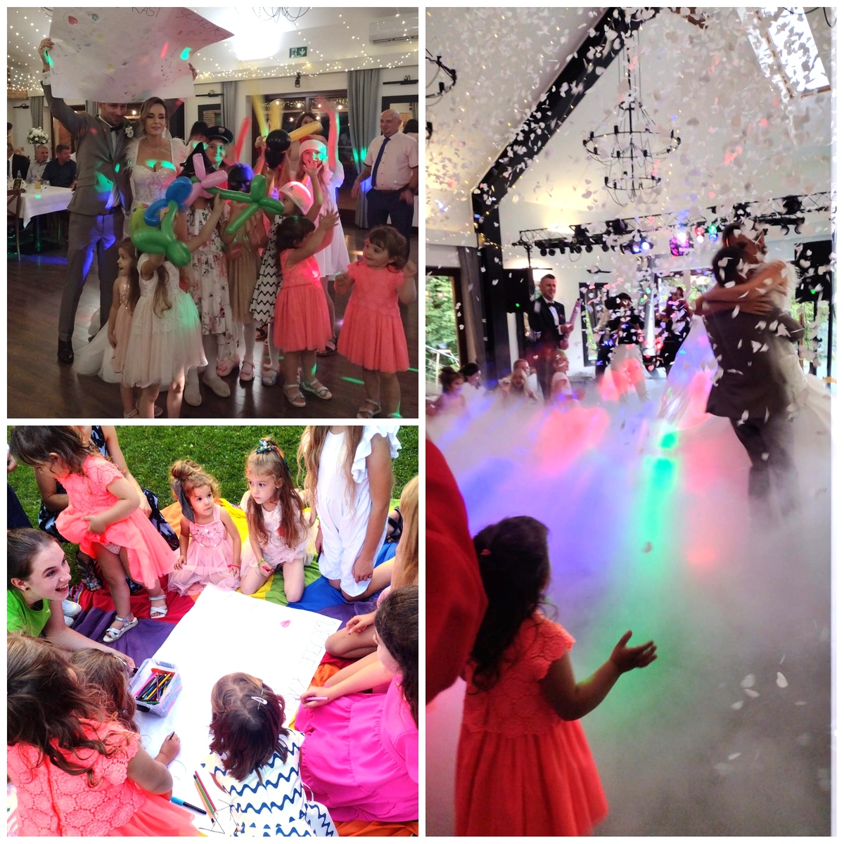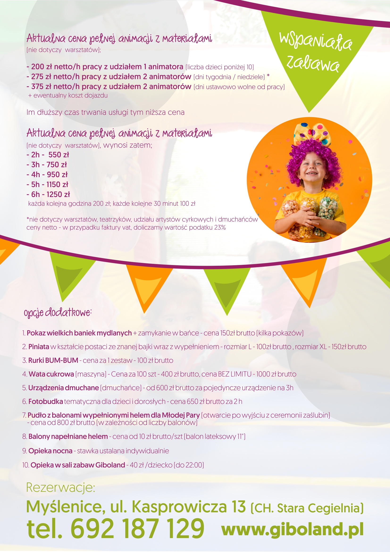Od 15 lat prowadzimy animacje dla dzieci na weselach, komuniach, chrzcinach i innych imprezach. Zajmujemy najmłodszym gościom takich imprez czas, prowadząc gry i zabawy animacyjne z wykorzystaniem ciekawych rekwizytów, malujemy buźki, modelujemy figurki balonowe, wykonujemy prezent dla pary młodej lub jubilata, uczymy dzieci prostych układów choreograficznych a w okresie letnim oferujemy także dmuchańce. Cena za godzinę to 275zł z udziałem 2 animatorów.