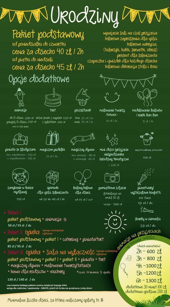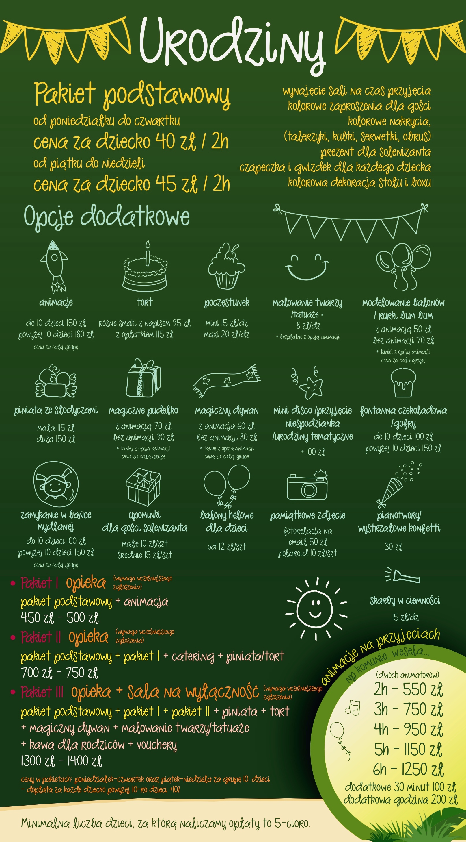 Organizujemy imprezy urodzinowe kompleksowo od A do Z, wystarczy zarezerwować termin imprezy a my zajmujemy się całą resztą: dekoracje i przygotowanie salek urodzinowych, przygotowanie cateringu i tortu urodzinowego, dostosowanie oprawy muzyczej i prrowadzenie profesjonalnych animacji. W ramach usługi również OPIEKA nad dziećmi oraz prezent dla solenizantów.