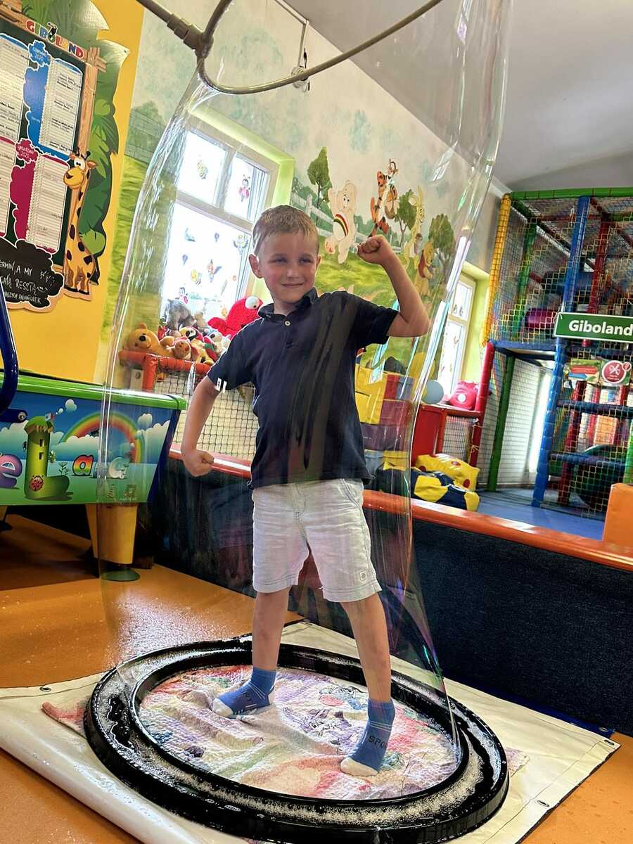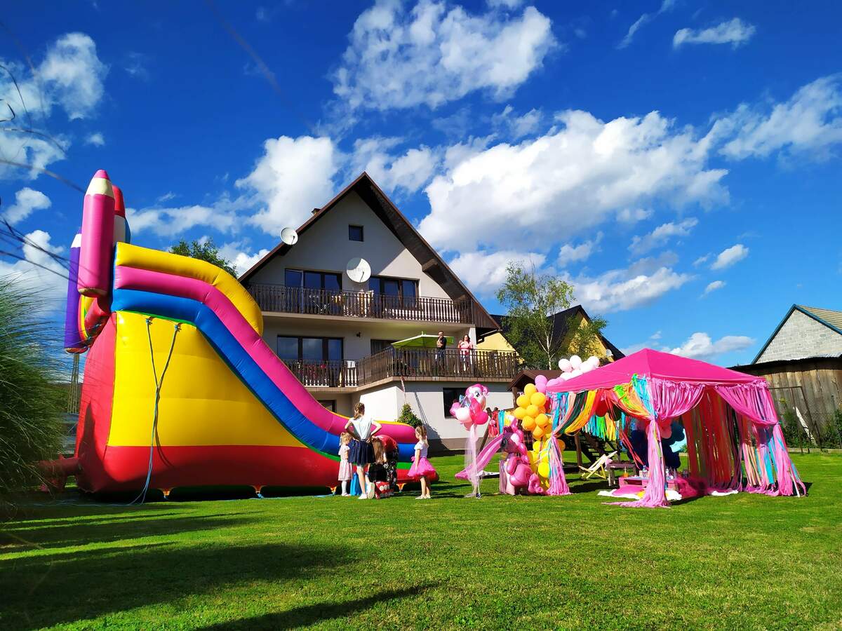 W sezonie od 1 maja do połowy listopada, udostępniamy urządzenia dmuchane. Giboland wynajmuje dmuchańce z obsługą w pakiecie z animacją, zatem jest to super pomysł na świętowanie urodzin dziecka w przydomowym ogrodzie. Do dyspozycji mamy kilka atrakcji z których najpopularniejsze są zjeżdżalnie dmuchane o wymiarach 9m x 8,5m x 8m. Koszt wynajmu to 200 zł za godzinę i aby móc skorzystać z oferty, konieczne są dogodne warunki pogodowe i możliwość dojazdu samochodem dost.
